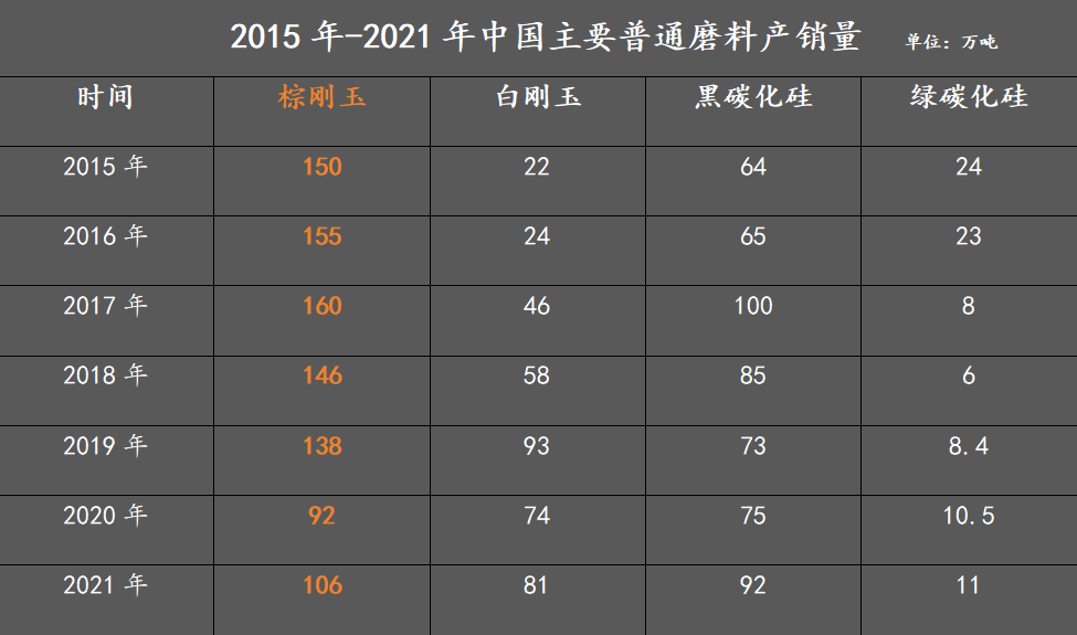 表2 2015年-2021年中國主要普通磨料産銷量